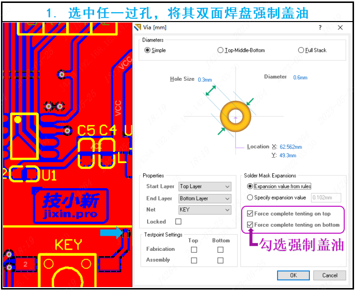1. 双击任一过孔(via),把"Force complet tenting on top/bottom"选项前面的两个框都勾选上:勾选了TOP表示顶层焊盘强制盖油;勾选了BOTTOM表示底层焊盘强制盖油