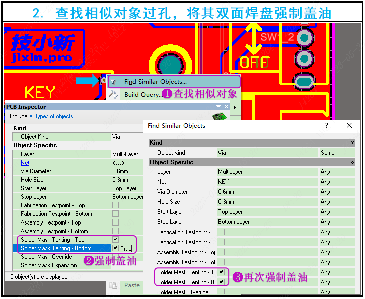 2. 右键单击选择这个过孔(via),然后选择“Find Similar Objects”查找相似目标,再把“Solder Mast Tenting-Top/Bottom”后面的两个框都勾选上OK确认,最后再确认选择一遍就可以了