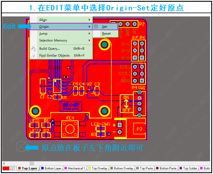 一、定义原点:在Edit菜单中选择Origin-Set (快捷键E-O-S)定好原点,一般放在左下角附近即可。