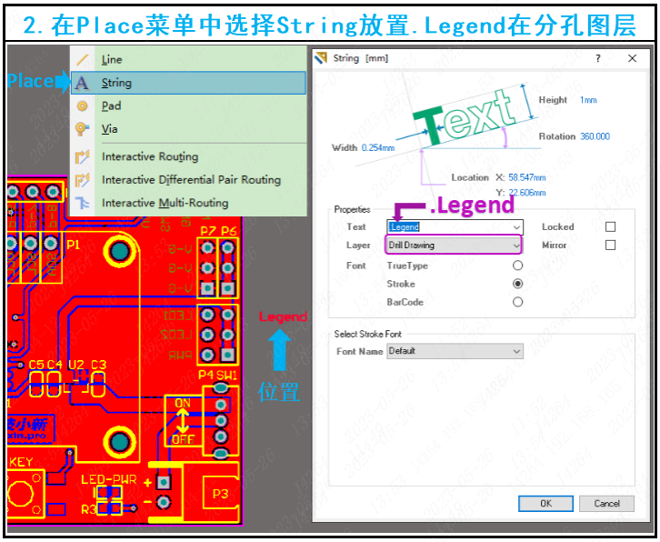 二、放置分孔图表:在Place菜单中选择String放置“.Legend”(快捷键P-S)在DrillDrawing(分孔图层),位置在板子右边或上方。