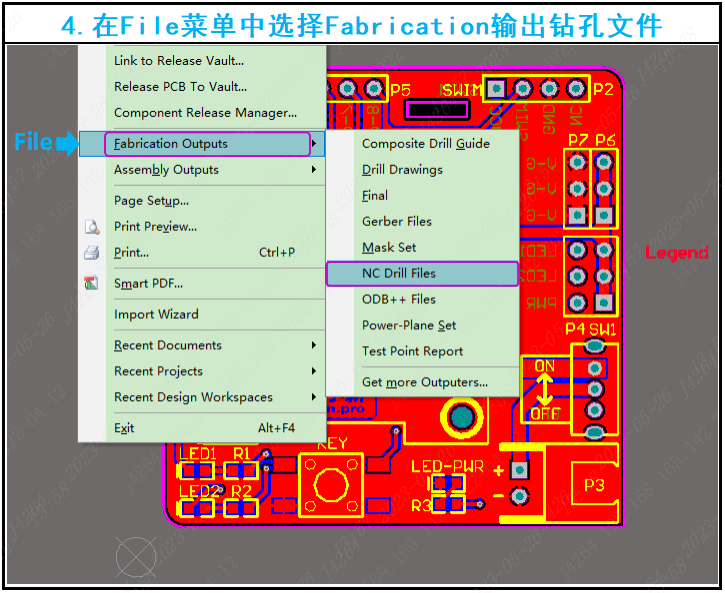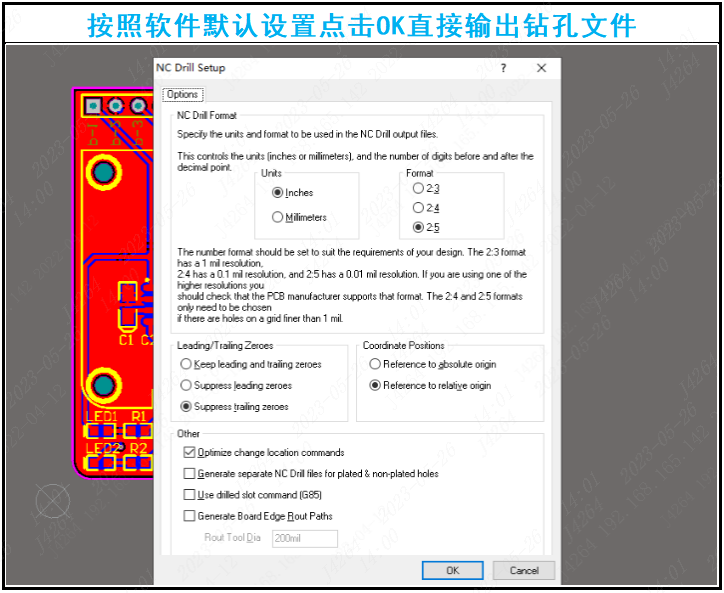 四、输出钻孔:在File菜单中选择Fabrication Outputs-NC Drill Files输出钻孔文件