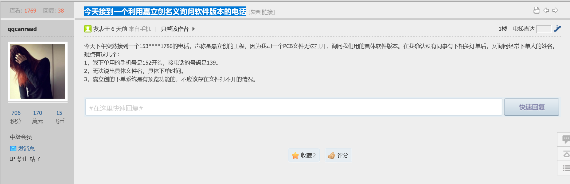 手法:因为嘉立创客户众多,以嘉立创之名说你的文件打不开之类,或是以其它之名,然后问你AD版本,然后套取消息!