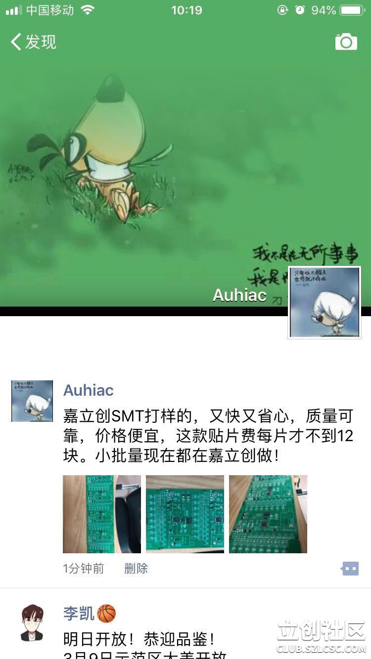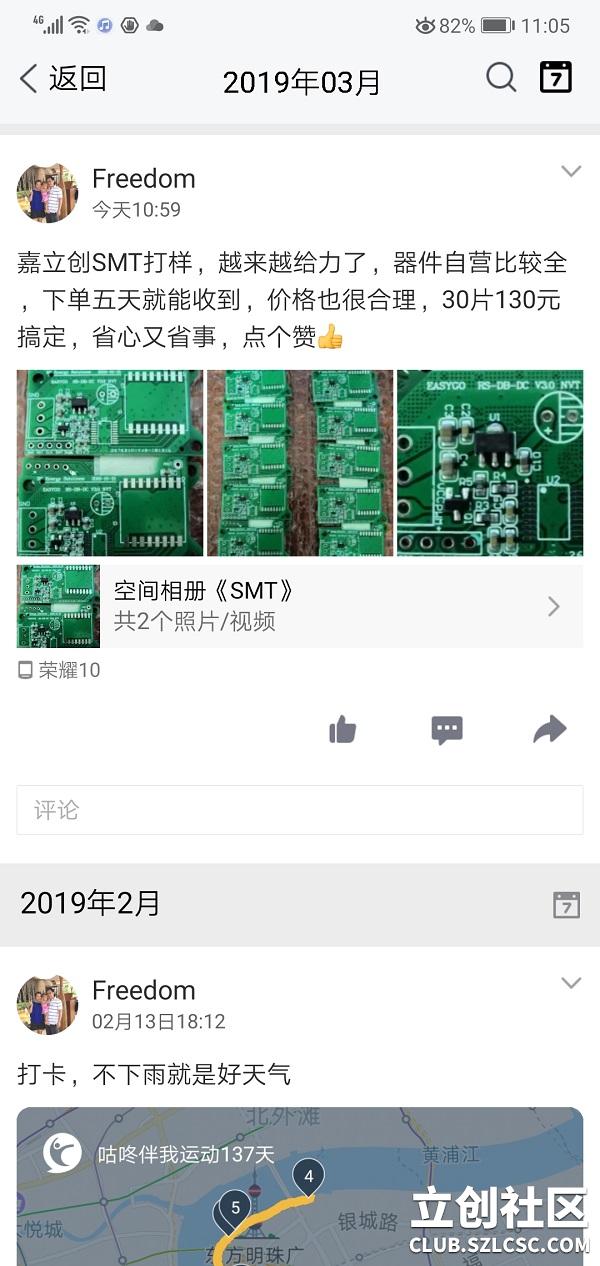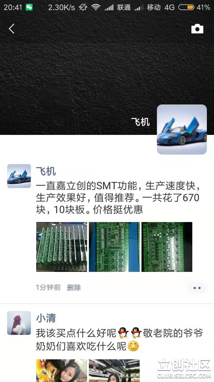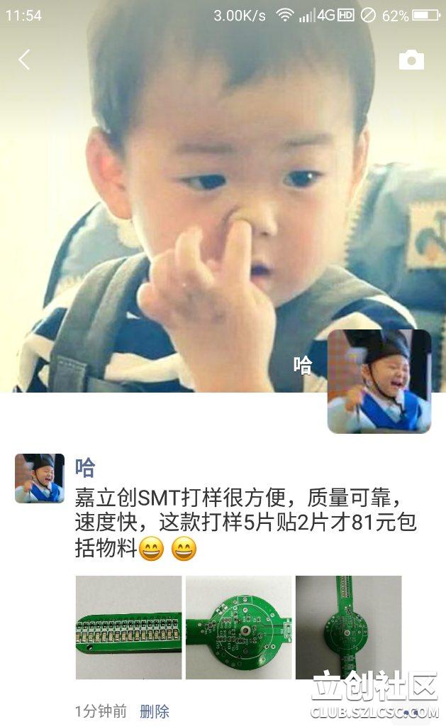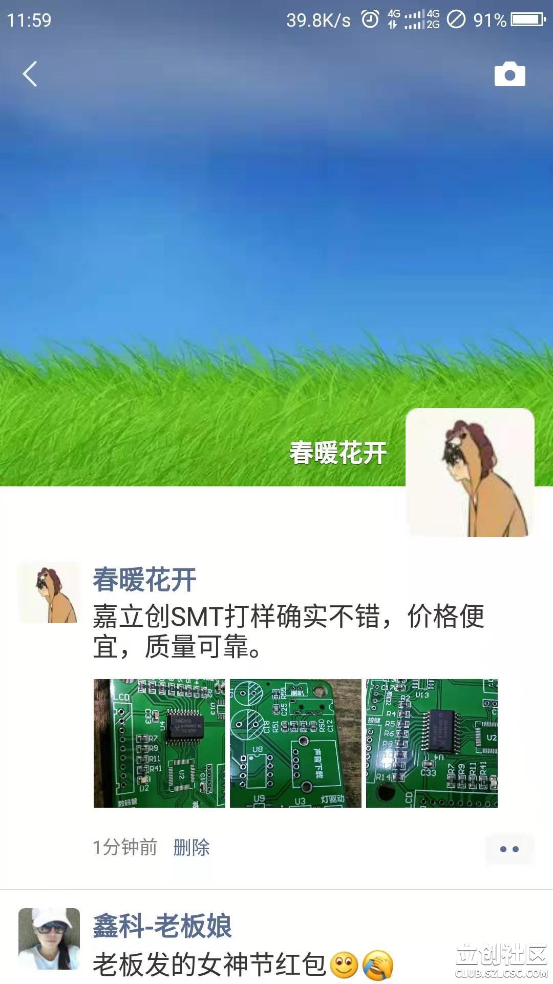 得到了大家的积极参与,在发表的朋友圈中对于我们的认可让我们信心满满。。。。感谢你们对于嘉立创SMT打样的认可以支持,下面是在社区的晒图图片,因为太多,以下是部分: