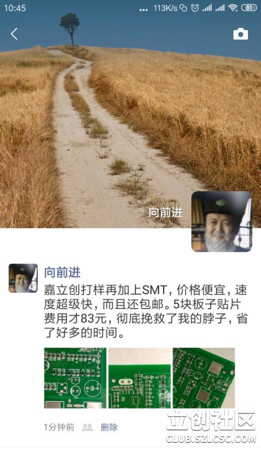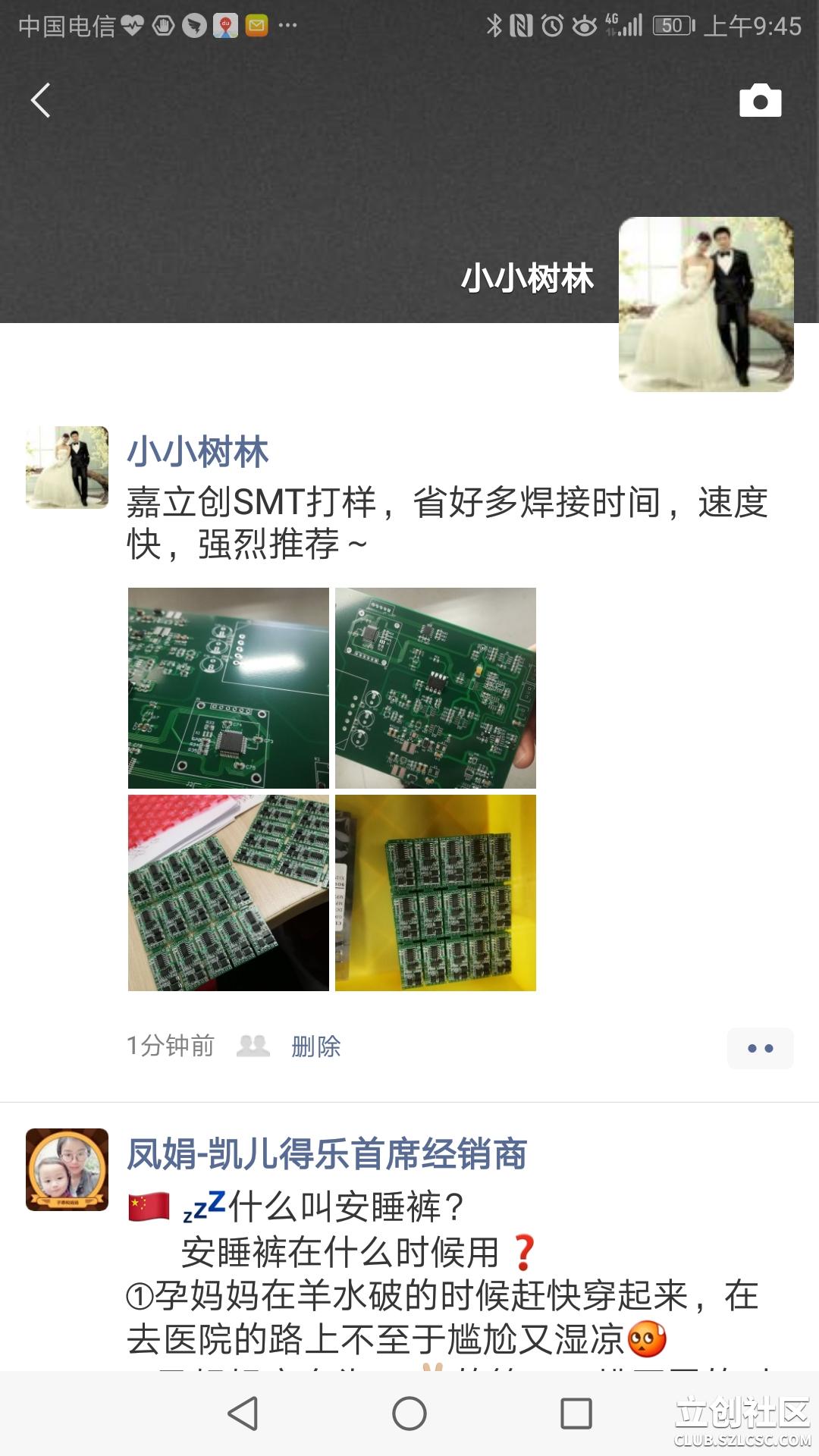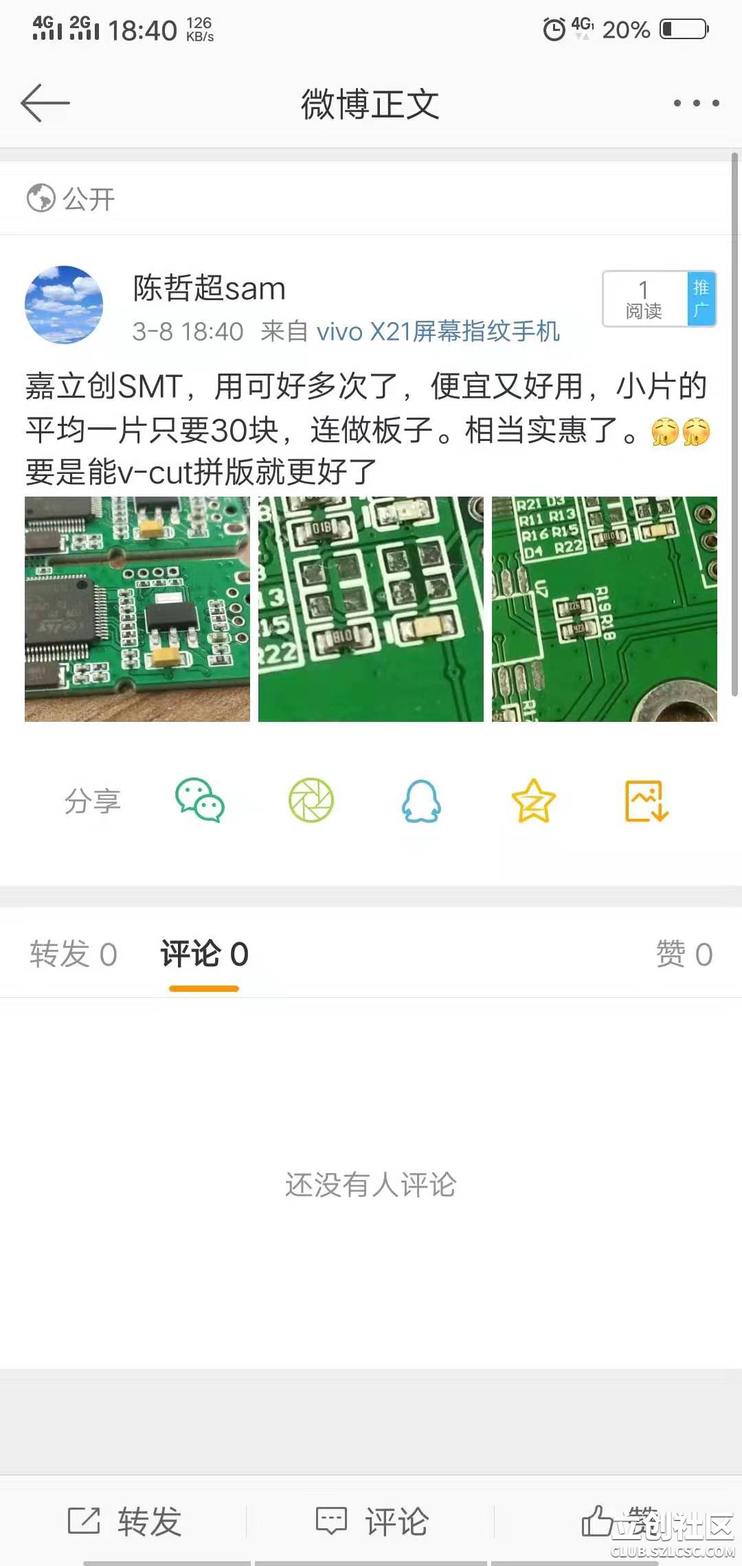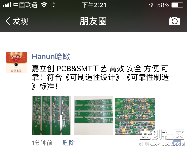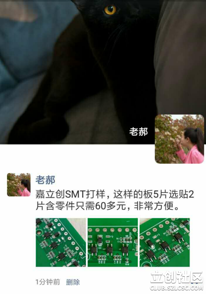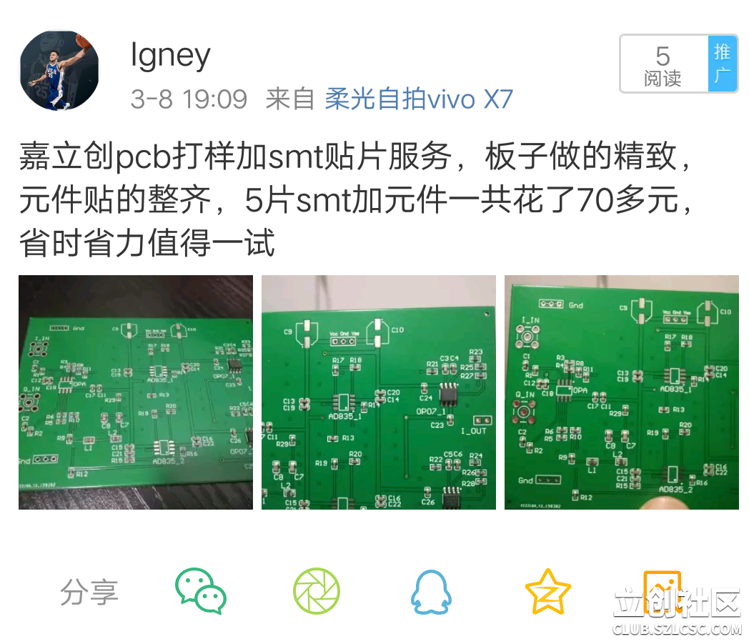 得到了大家的积极参与,在发表的朋友圈中对于我们的认可让我们信心满满。。。。感谢你们对于嘉立创SMT打样的认可以支持,下面是在社区的晒图图片,因为太多,以下是部分: