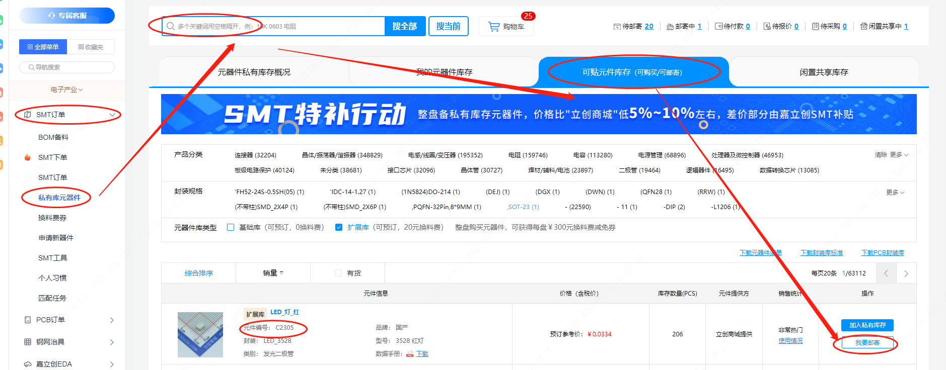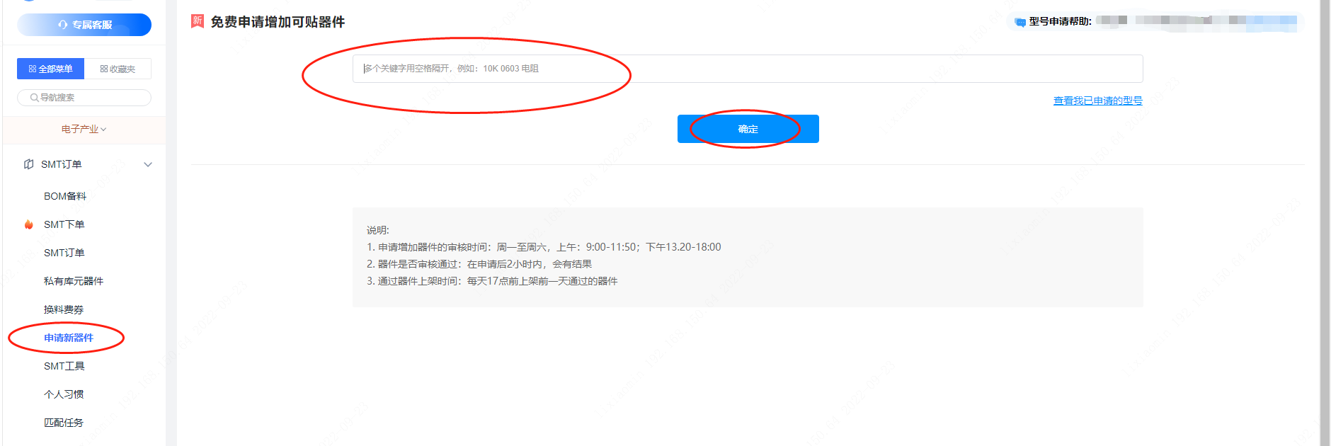 答:必须先申请把这个器件添加到可贴元器件列表中。嘉立创审核通过后,并显示“已上架”后就可以寄料,操作如下: