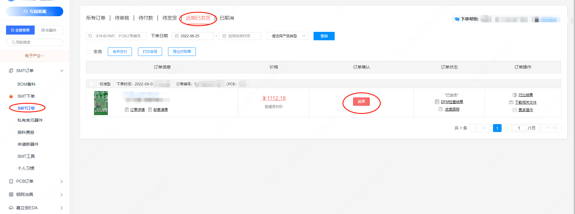 第三步:在PCB提交订单后,在【SMT下单】的菜单内会体现出来需要返单的SMT订单,如图所示在文件名后面会带有“返单”字样。