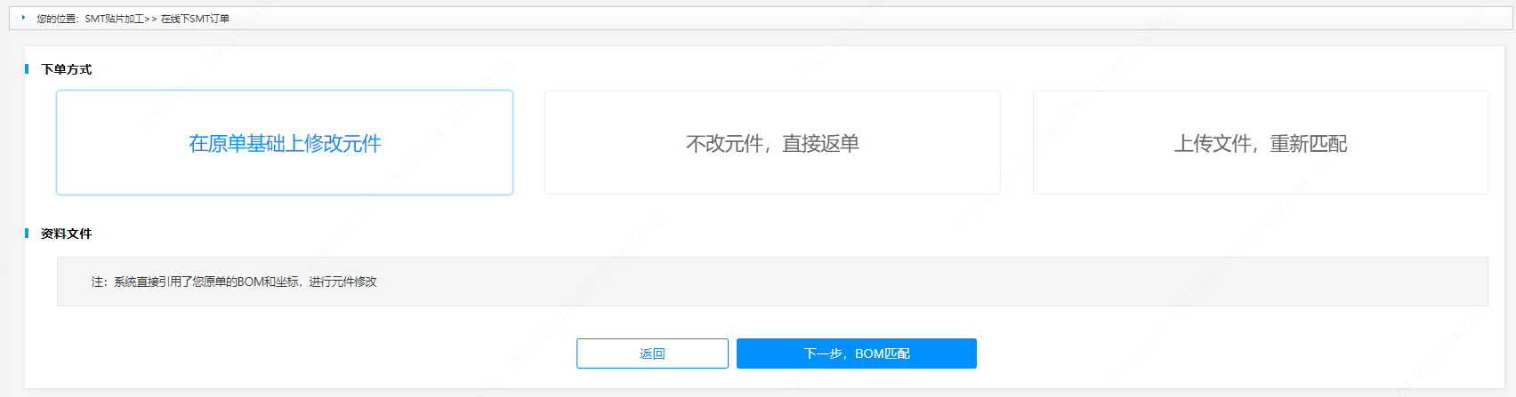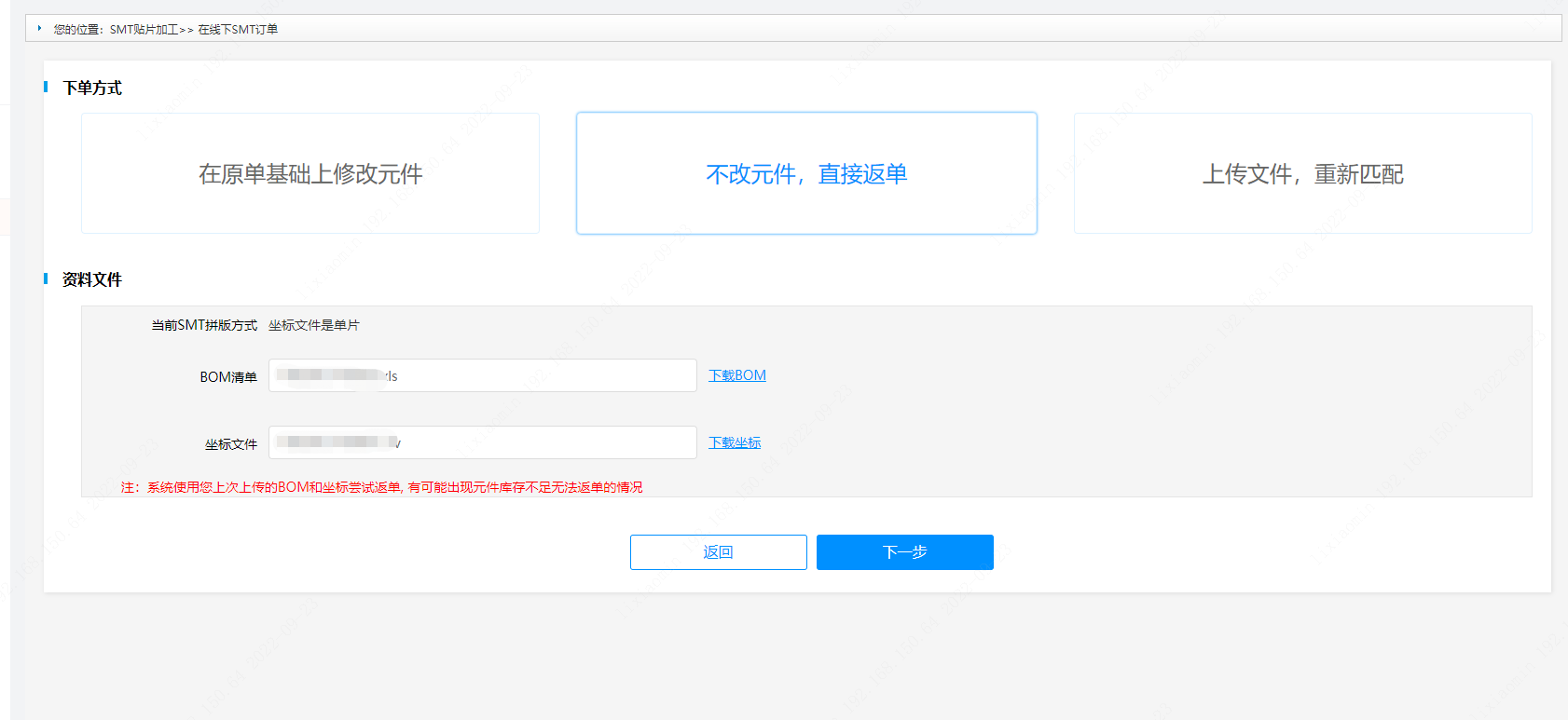 第四步:而后点击【去下SMT】按钮后会出现“下单方式”、“资料文件”页面框,您可以选择您需要的【下单方式】(“在原单基础上修改元件”/“不改元件,直接返单”/“上传文件,重新匹配”)后点击下一步。