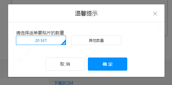 1.对于PCB数量在100和100片以上,系统会弹出“”返单要贴片的数量的页面,您根据需要选好数量。