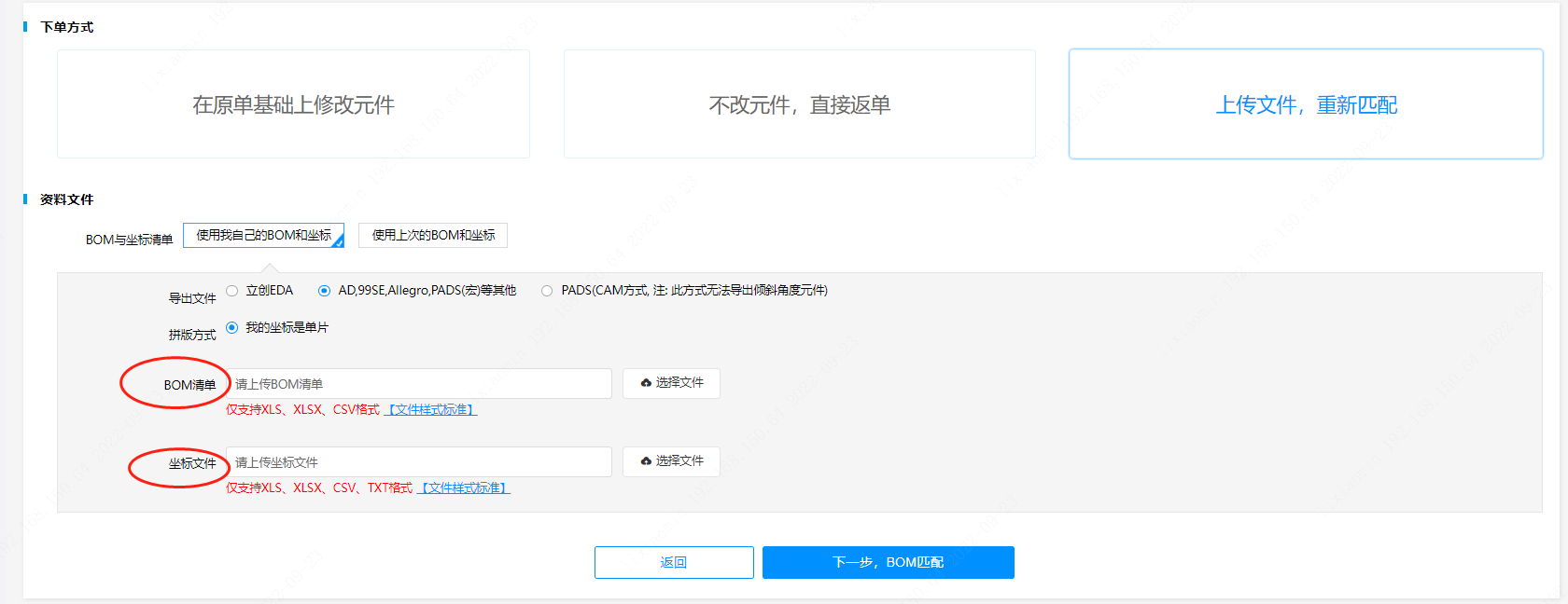 选此方式下单,需要上传新的BOM和坐标文件,点击“下一步BOM匹配”后,会进入BOM匹配界面,您选择您需要的器件即可,后按流程操作即可成功下smt订单,此时SMT为新单。