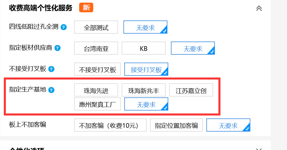 现在嘉立创有几大生产基地(嘉立创所有工厂全为嘉立创自有工厂,非所谓极个别同行“协同”工厂,协同工厂本质就是订单外发给其它的不知名的其它工厂),遍布长三角及珠三角,形成了了战略上的支撑起到了重要作用(如停电,环保政策各种原因),对于订单,系统全是从地域,各工厂产能及拼版利用率综合考虑自动化安排,但是有一些客户对于交期相对比较急或是对于一些工厂情有独钟,需要”指定生产基地“生产的服务,为了满足这部分的客户的需求,嘉立创开放了指定”生产基地的“的服务(限定为一些常用工艺),指定生产基地是人为的影响了系统的运作,降低了拼版利用率,如果人人指定则完全无法运作,为此把”指定生产基地“服务做为收费项目出现以满足真正需要的客户!