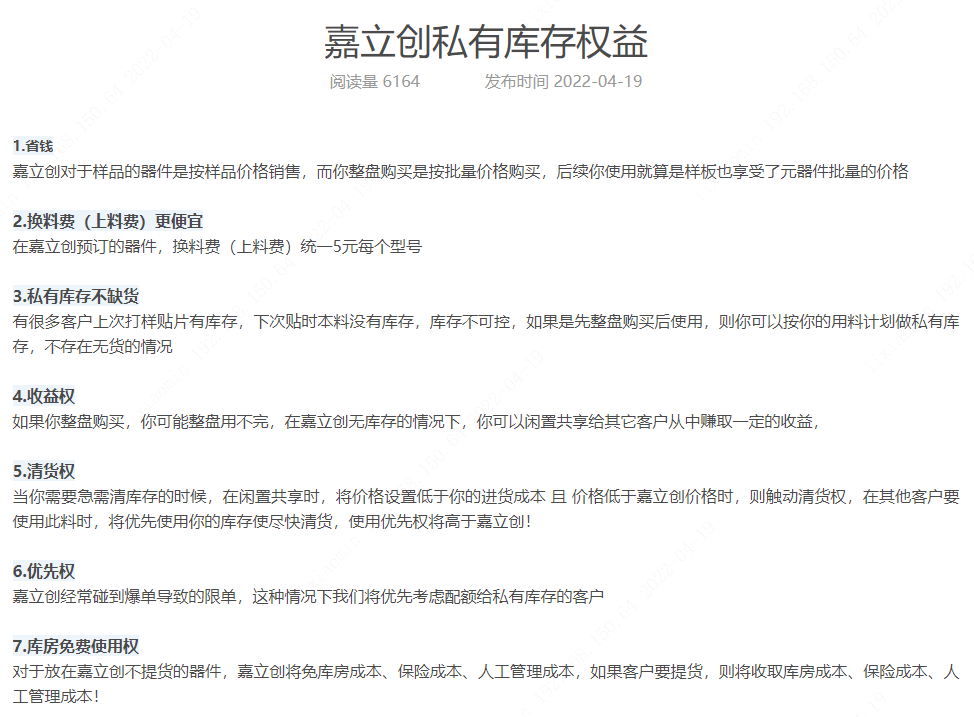 一、客户通过预订的器件,如有多出的器件使用不完可以在嘉立创发布闲置,不用担心器件会过期。对于热门的物料如市场上缺货,还可以加价发布闲置。备货私有库存有很多权益。权益如下: