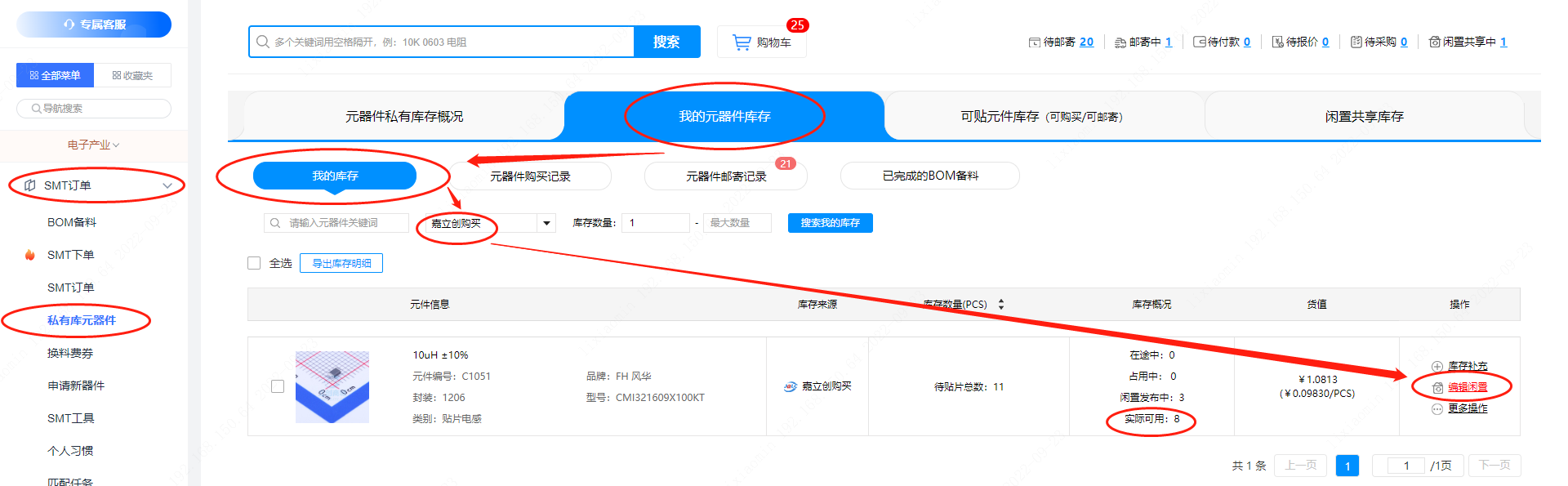 第一步:在【私有库元器件】--【我的元器件库存】--【我的库存】内“库存来源”处选“嘉立创购买”后可以查看库存总数。如有多出可点击“编辑闲置”按钮。