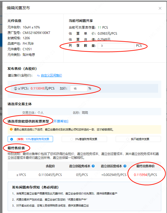 第二步:点击后会显示编辑闲置发布页面框,可以看到器件参数等信息,您输入共享数量、加价比,并选择您能提供的发票类型(选择后会出现最终出售单价),阅读《发布闲置库存须知》并勾选,而后点击“确定发布”。