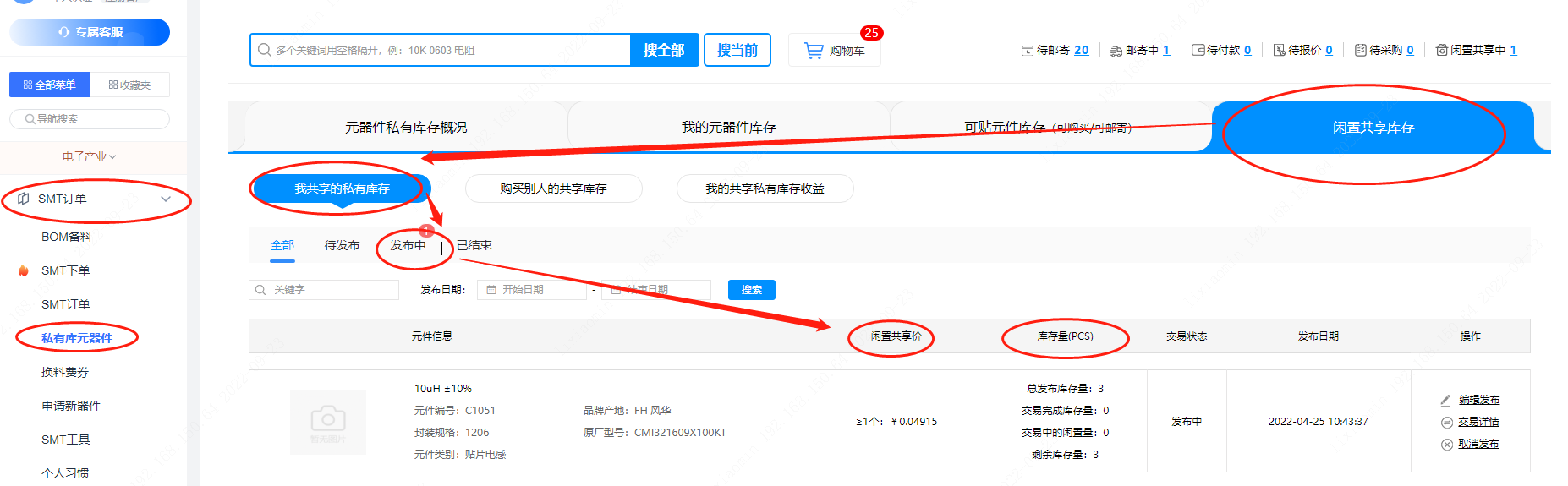第三步:若您想查看所发布的共享库存器件,点击【私有库元器件】--【闲置共享库存】--【我共享的私有库存】--【发布中】即可,可以看到库存量、闲置共享价等等信息。