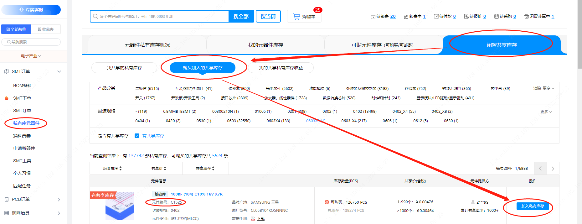 点击【私有库元器件】--【闲置共享库存】--【购买别人的共享库存】,找到您需要的器件,点击“加入私有库存”即可。