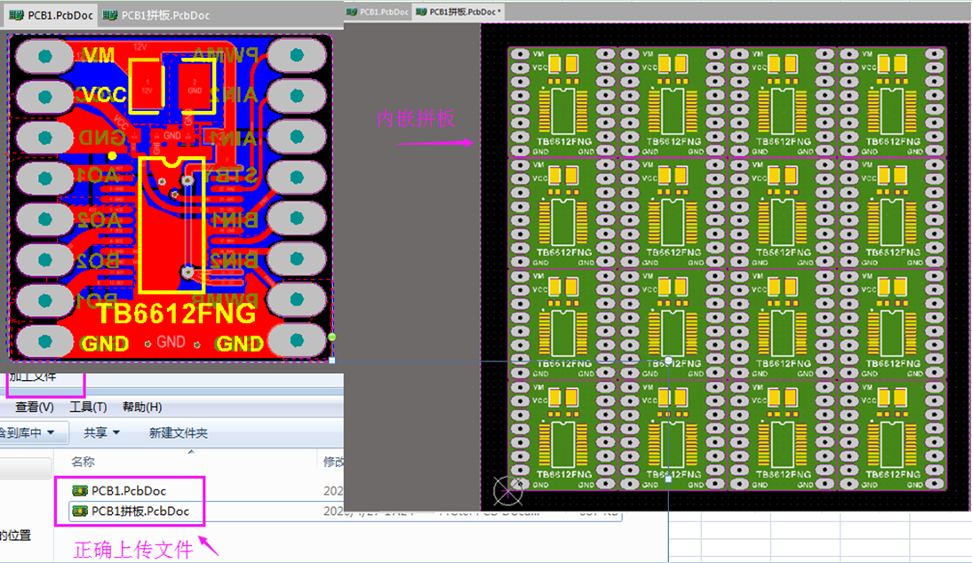补充,可能文字表述内嵌拼板,部分工程不理解,如下图左上图是单片文件,右图是采用嵌拼板文件.内嵌拼板是在单片文件基础上内嵌.如单一上传(拼板文件),没有单片文件,拼板文件只有一个外框是没有其它元素.具体打包如下图左下角参考,谢谢!