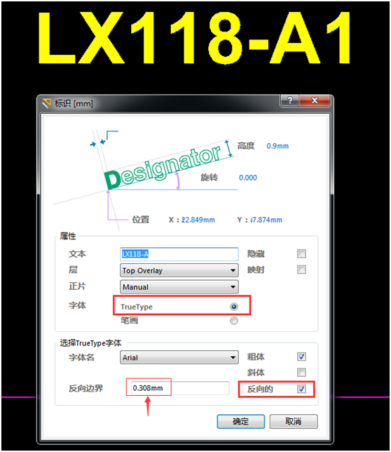 二. 双击已经放置好的文本更改属性(或在放置的状态下按Tab键修改属性),如下图所示进行更改,即可完成镂空字体的放置。