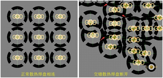 对于这种内层“散热盘与隔离带重叠”引起断开的,在软件设计上是没有问题的,软件网络分析检测也会认为是相连的,但实际上是“假连接真断开”,类似的还有“散热盘重叠”等会引起线接不良。