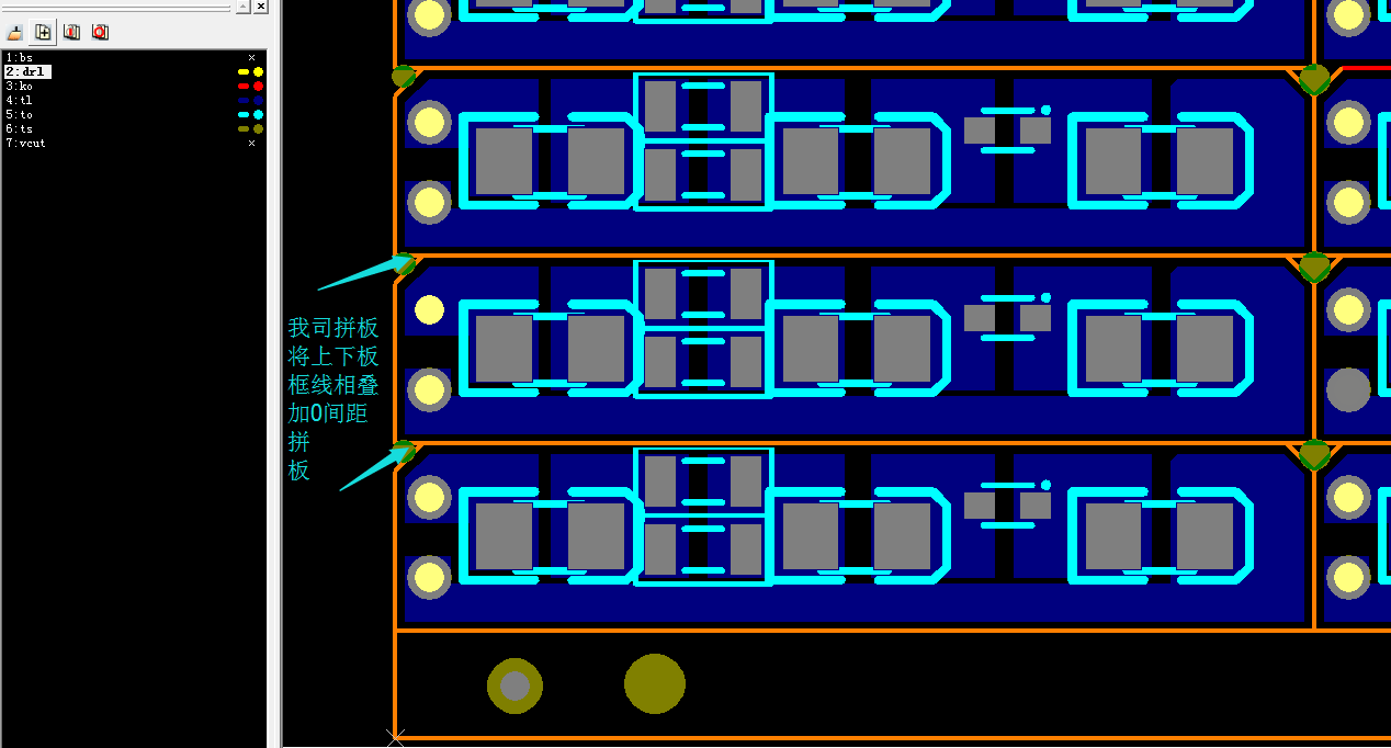 PCB打样拼板示意图PCS和PCS(上下)间距不一致,PCS和工艺边(左右)间距也不一致,有的0.3mm,有的0.4mm又有的按0.1MM间隙不等拼板。那么CAM工程将统一按0间距(也就是板框线完全相叠加)拼板。如您要供拼板,请一定要把您的原文件及需要供用的拼板的生产文件一起打包上传附件投单。不然无法关联拼板供用钢网相关信息。
