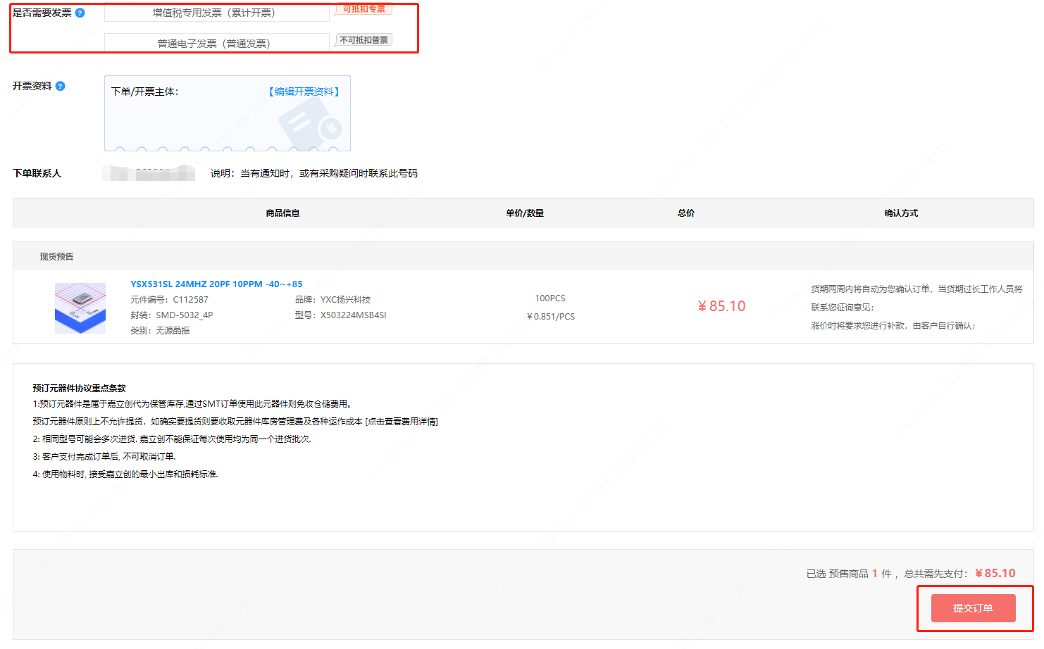 (要注意查看购买的物料是“现货预售”还是“嘉立创帮您预订”;预订的交期正常在报价后2周内,超过2周交货的会有客服联系,后续在预订的时候系统上会有提示与确认)。