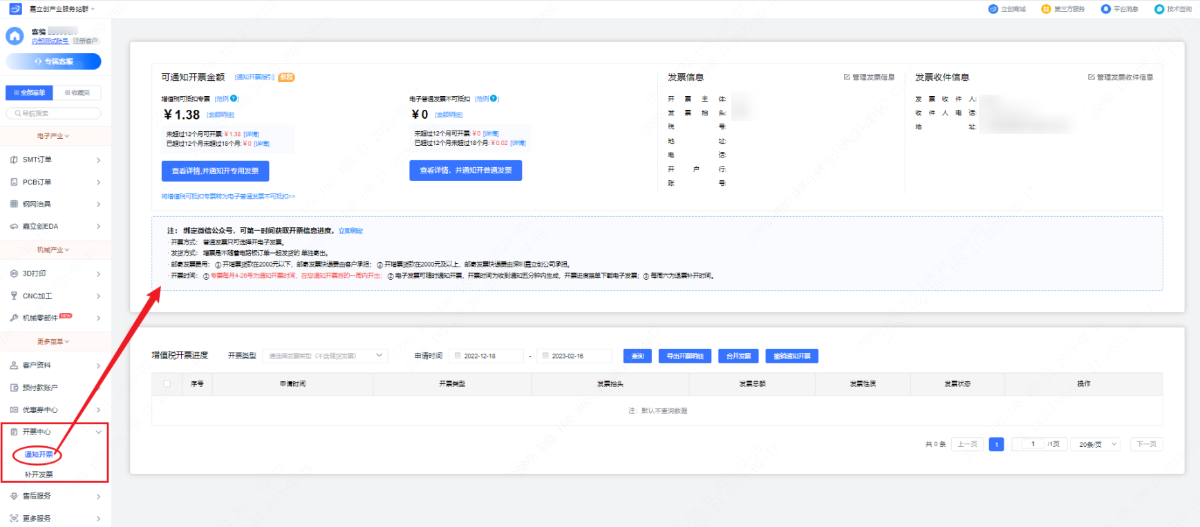 第一步:点击【开票中心】---【通知开票】后,点击【查看详情,并通知开专用发票】按钮;