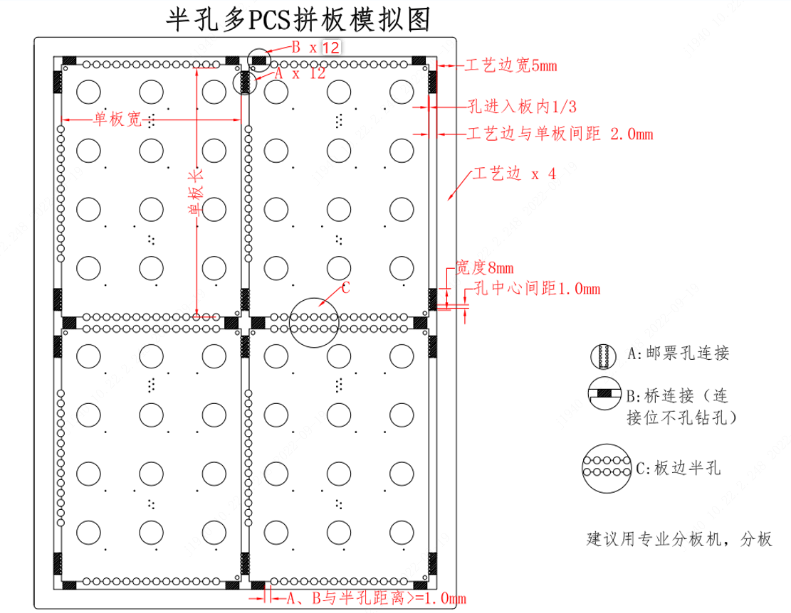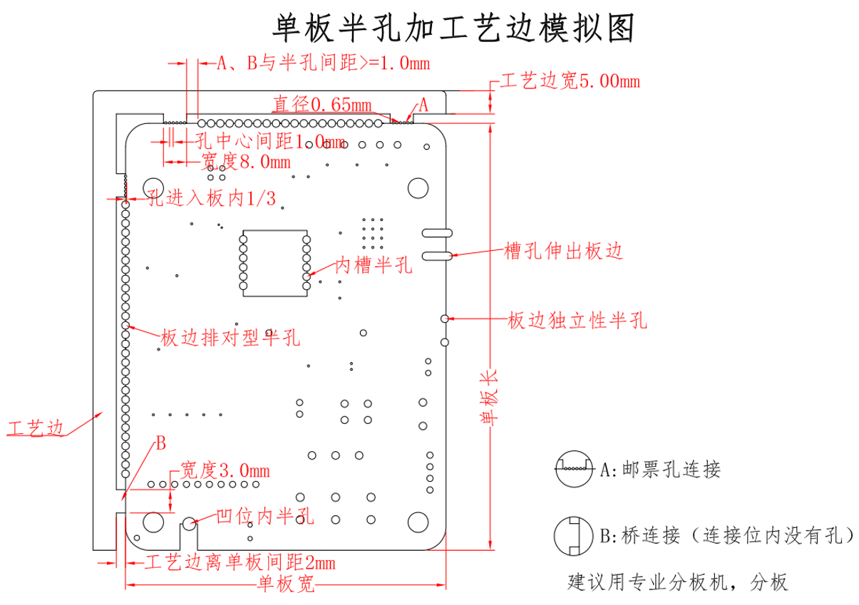 1. 单板出货:“板边排队型半孔”的需要增加工艺边,把半孔包围,不可以直接在板边。