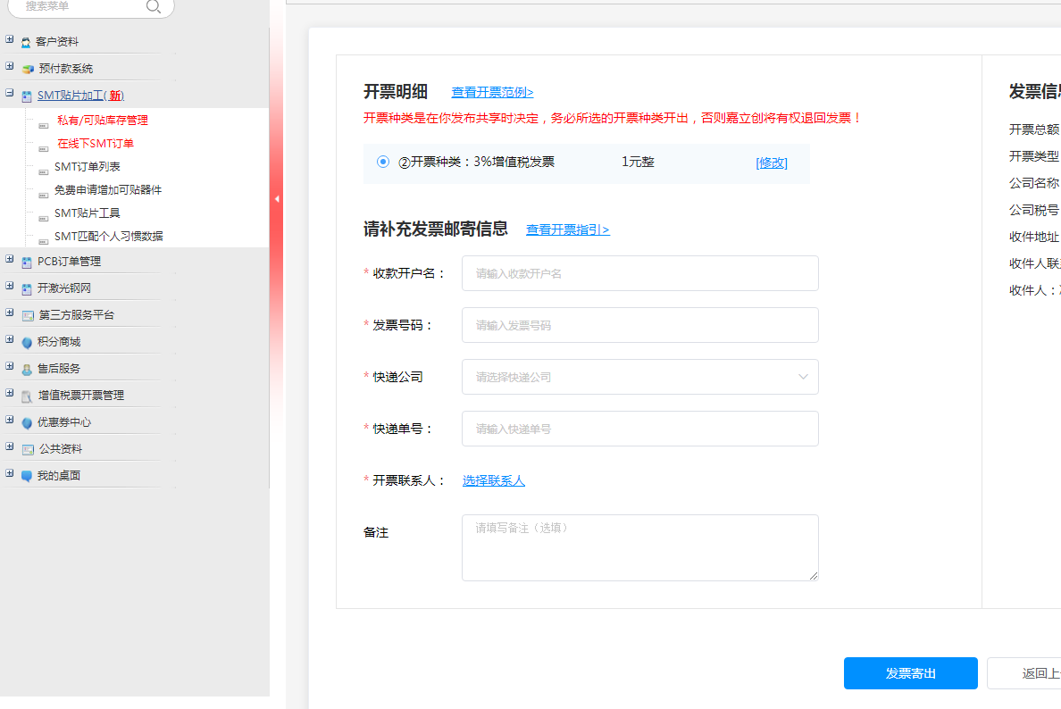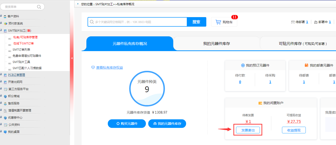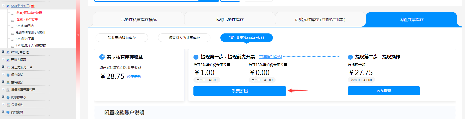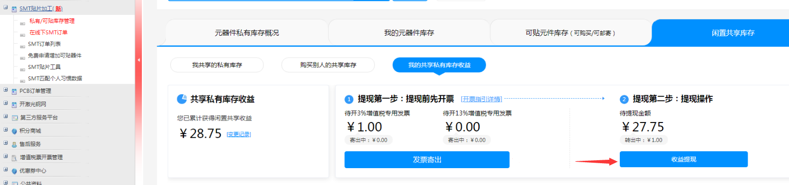 3)嘉立创收到发票后,便可以在“私有库存首页” 或 ”我的共享私有库存收益”中选择提现