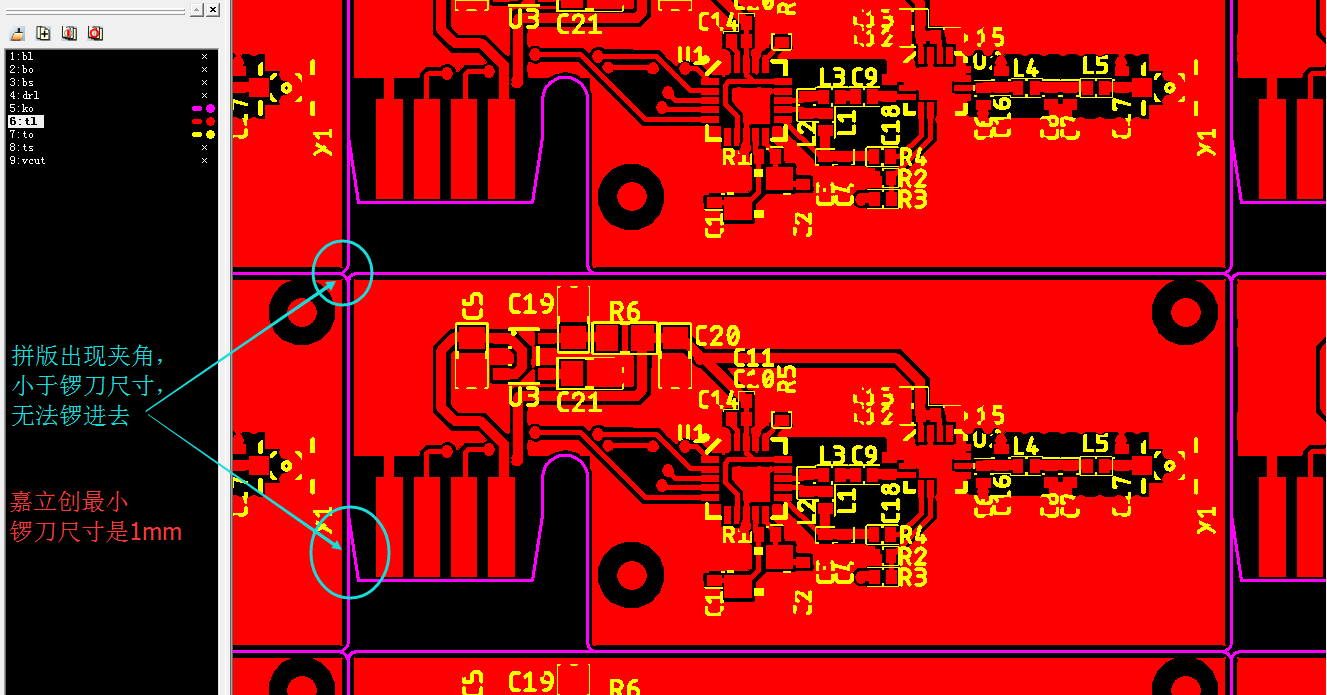 拼板前一定要考虑外形夹角、斜角、凹凸点、弧形结构等。生产过程中小于锣刀最小尺寸(1mm)的不能完全保证外形夹角铣边成形到位,只是尽可能减小夹角位外形成形问题(不接受反馈)。