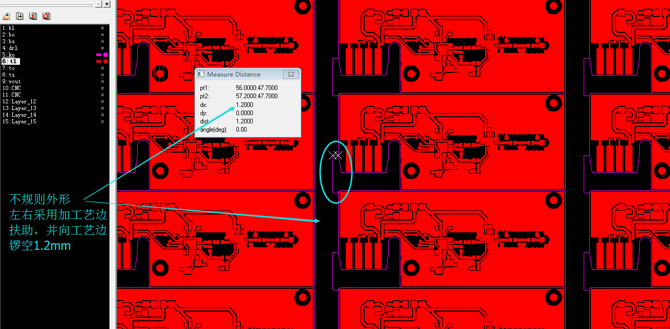 为了提高生产效率,采用连片拼板,但不规则外形常见错误,像有些小角度,斜角外形拼版出现夹角,小于锣刀尺寸它是无法锣进去。(槽刀最小尺寸1.0mm)/portal/server_guide_4110.html