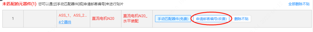 第一步:在下SMT订单选器件界面,未匹配到型号的器件,可以直接邮寄,可以点【申请邮寄编号(收费)】