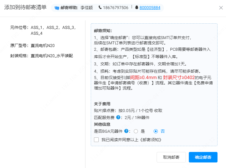 第十步:点完后会弹出确认邮寄元器件清单页面,这个页面需要您下好快递(记得在每个需要邮寄的器件包装袋上写好器件编号),下好后回来填好【快递单号】、【邮寄联系人】,阅读并勾选发货注意事项。