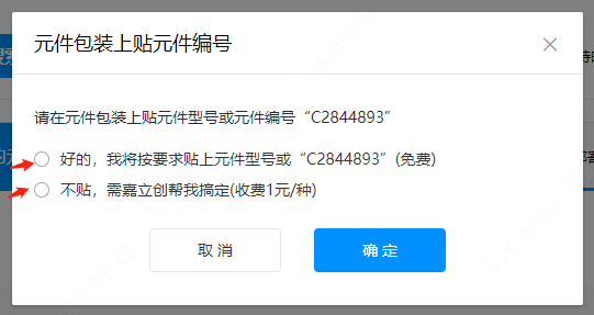 (1)点【请选择是否已贴编号】会出现选择弹窗,在元件包装上勾选由客户自己贴或嘉立创贴元件编号,并补充元器件的基本封装信息。
