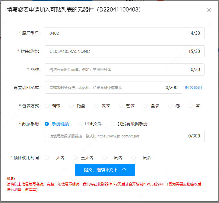 点击【待补全元件信息】,会弹出“填写您要申请加入可贴列表的元器件”的页面,需要客户提供元器件型号的尺寸信息。