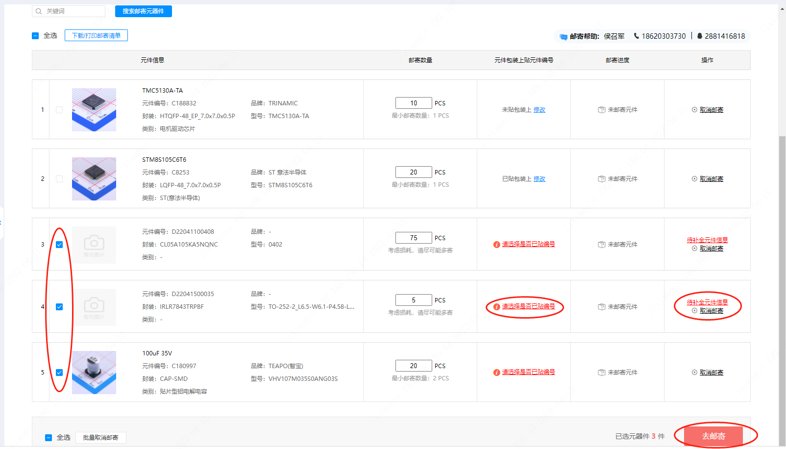 (3)在邮寄信息确认完后,客户可以勾选需要邮寄的器件后,点【去邮寄】按钮。