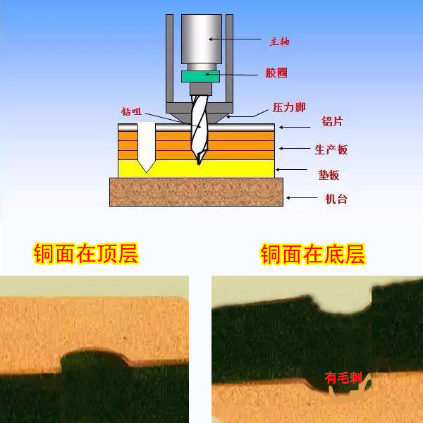 是钻头最先钻到铜面,由于底下是基板垫底,可以把铜面钻的很干净。而如果铜面朝下钻孔,就会产生大量毛刺披峰的。