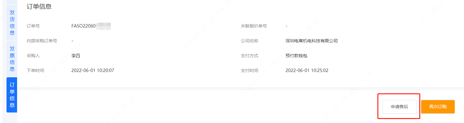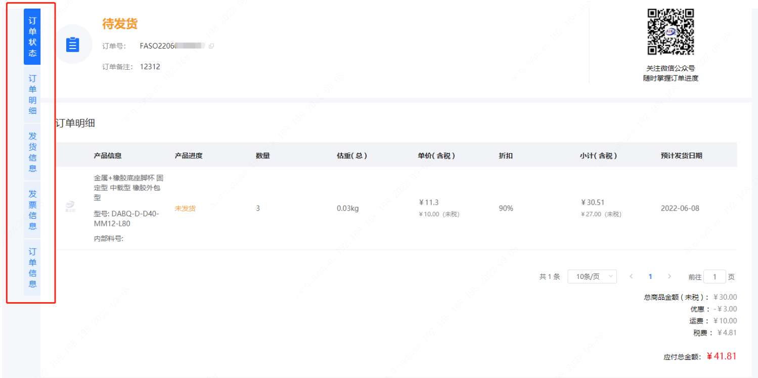 订单详情页可查看具体的订单信息、订单明细、发货信息、发票信息等