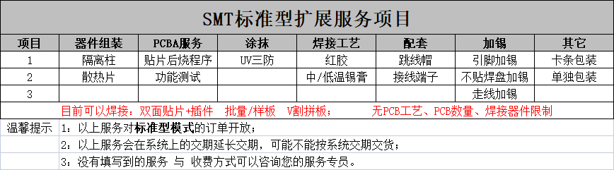 你们好!感谢大家对嘉立创贴片焊接的支持。为了能更好、更专业的服务您,近期我司新增加了关于标准型线下服务加工项目。目前具体可做的项目如下图: