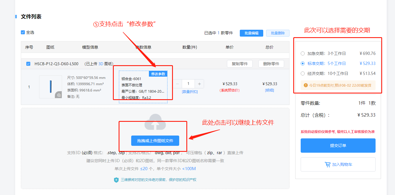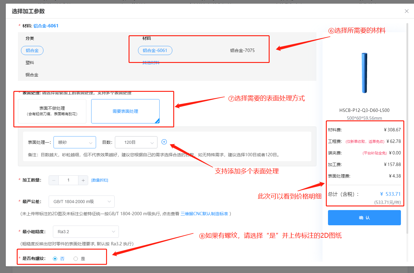 图纸上传成功后,系统会默认参数进行在线报价,点击“修改参数”,可以更换材料、表面处理、螺纹等信息,确认后即完成对该零件参数选择;
