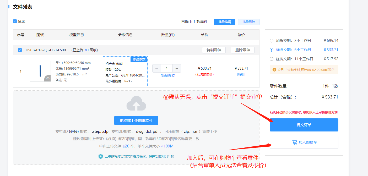 暂时不需要询价的零件,用户可加入至购物车(审单人员后台无法查看到未提交的零件信息,且不会对零件报价!!!)