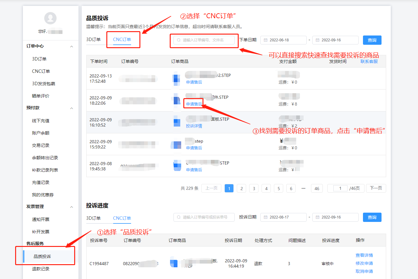 登录进入三维猴个人中心后,点击 售后服务 - 品质投诉,并切换到cnc订单,选择需要投诉的商品并点击“申请售后”;