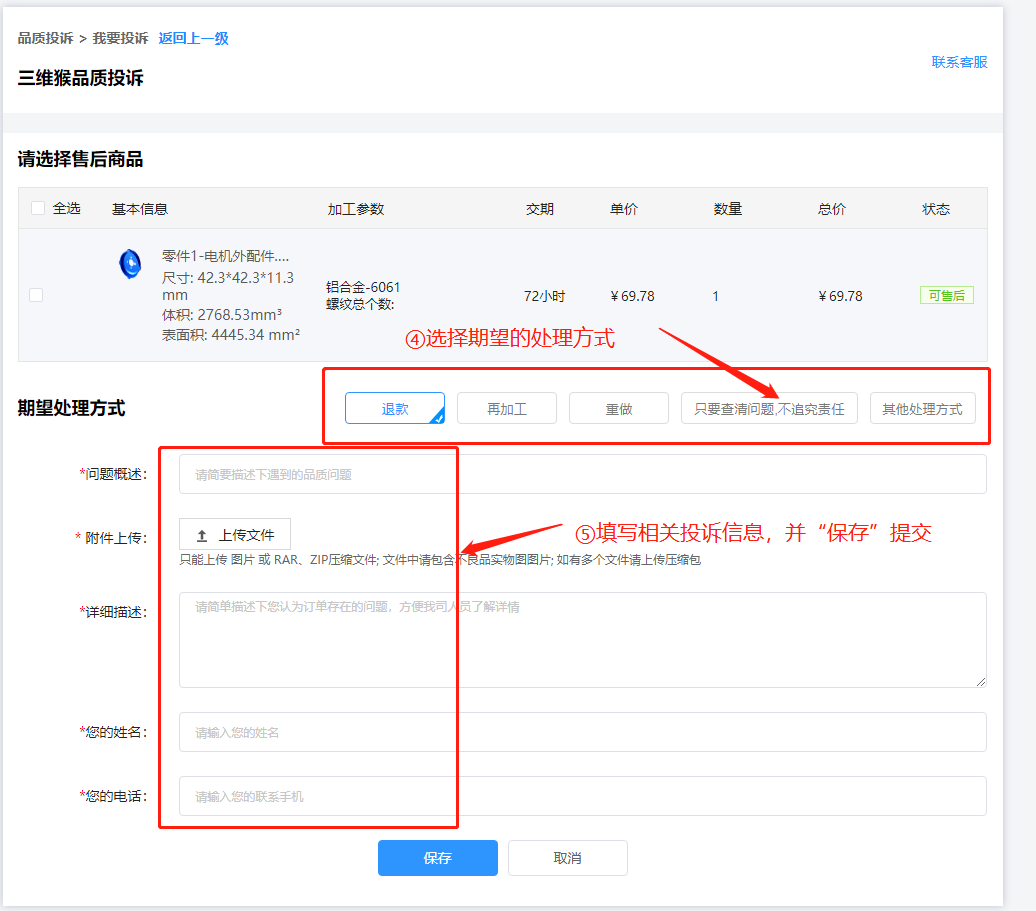 选择 需要投诉的商品 和 期望处理方式 后,填写对应投诉信息并保存提交;