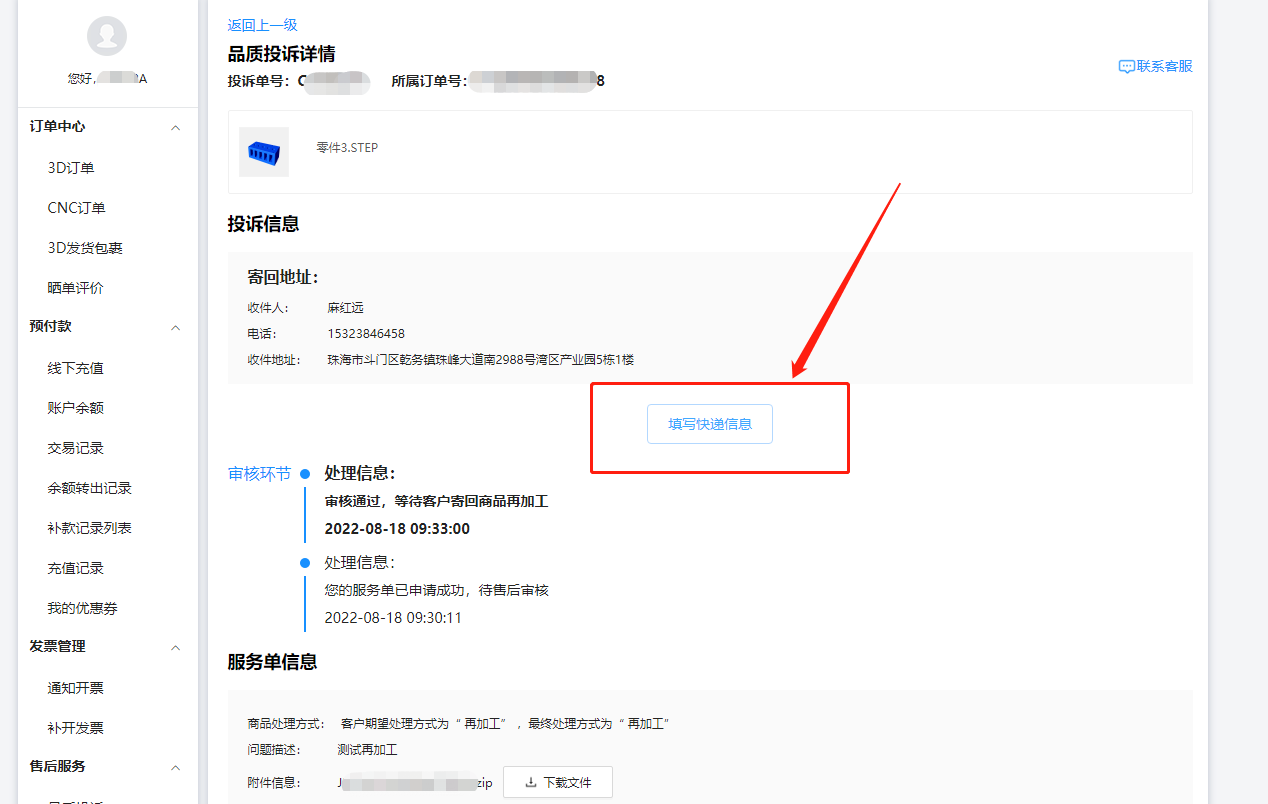 针对“再加工”的投诉单,审核通过后请务必在系统上填写对应快递单号,并用纸条写明对应订单号、投诉单号及品质异常原因,随工件一起寄出,否则系统将无法进行再加工处理!!