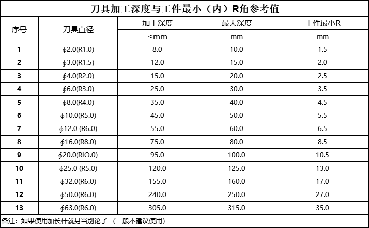 假设刀具直径为∮Dmm,内腔最大深度为Hmm,最小内Rmm为R 公式为R=(H/10)+0.5,∮D=H/5,例如:内腔深度是30MM,最小内R可以加工到R3.5mm=(30/10)+0.5,对应的刀具为∮6=30/5。目前我们最小内R能做到R0.5且深度≤3mm,内R越小,需要的刀具越小,加工成本会越高。