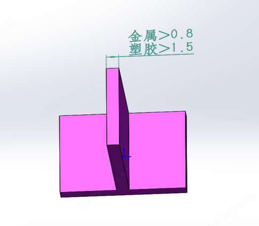 金属件的壁厚最好设计为0.8mm以上(最小可达0.5mm),塑料件的最小壁厚应在1.5mm以上(最小可达1mm)。