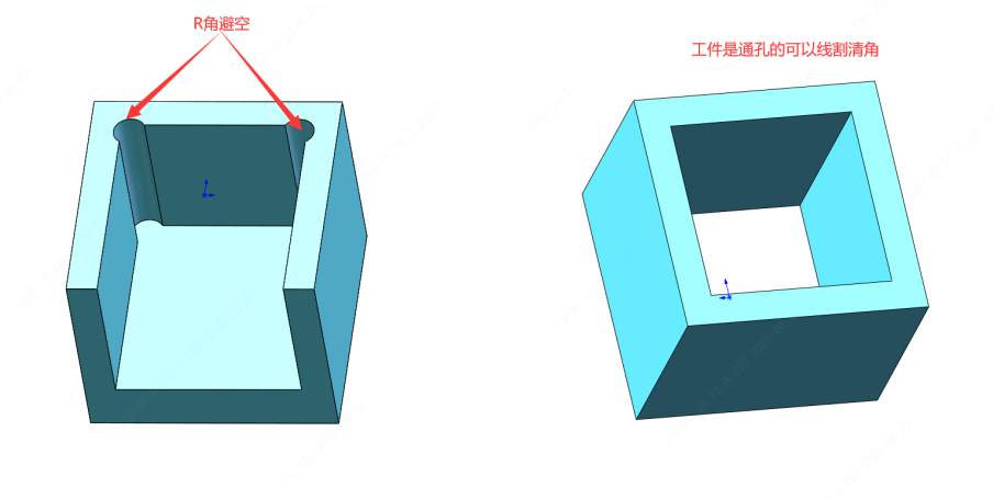 若需要工件保留直角,请您提供2D图档标注说明,需要火花机放电清角处理(清角需要CNC加工铜公后再在火花机上放电加工,成本较高),或者更改工件结构,做R角避空位,CNC直接加工出来,成本较低。如果工件两面是通孔可以在线割机上切割加工清角,成本较高。