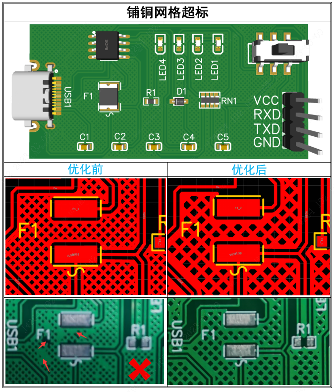 因此,对于低于此间隙的铺铜网络(生产易粘连或缺失),建议铺实心网络或是拉开间隙保证网格线宽线隙在0.254mm以上
