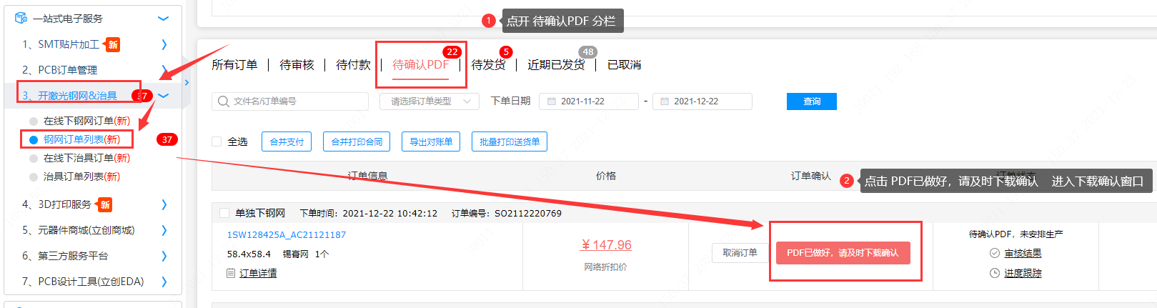 确认PDF文档需先付款,付款后等1-2小时工程出文件,然后在钢网订单列表中点击【PDF已做好,请及时下载确认】。根据实际情况点击后面的操作按钮。如下图所示: