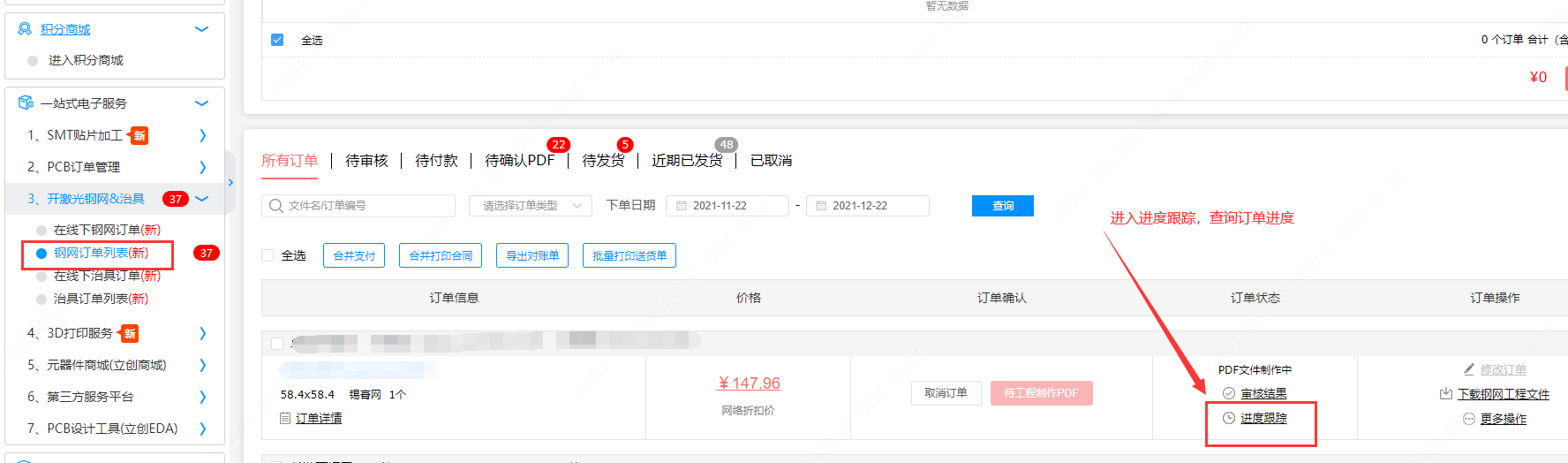 但是SMT订单的钢网进度查不到