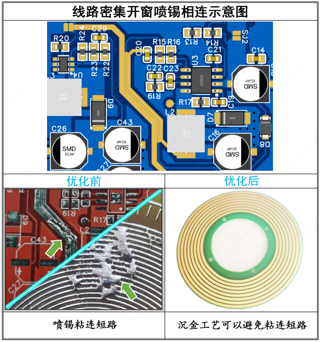设计优化:密集线条开窗喷锡易粘连建议做沉金