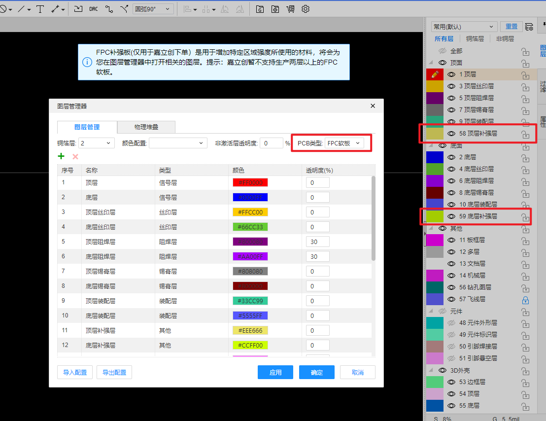 - 在放置时,我们会为您在图层管理器中自动切换PCB类型到FPC软板,打开补强专属的两个图层,用以生成Gerber生产文件